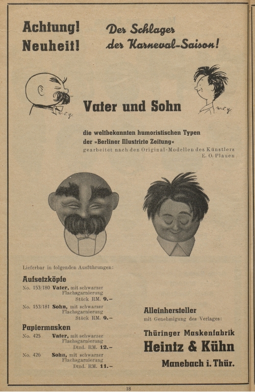 Zum Vergleich: Auszug aus dem Verkaufskatalog der Maskenfabrik Heintz&Kühn aus dem Jahr 1938, in dem die beiden Aufsetzköpfe von Vater und Sohn als exklusive Neuheit angeboten wurden.