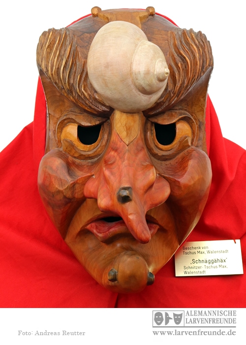 Die Maske der Schnäggähäx wurde 1988 von dem Tscherler Bürger und Maskenschnitzer Max Tschus entworfen.